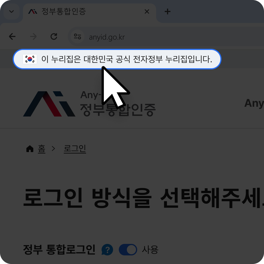 정부 통합로그인(Any-ID)을 지원하는 대한민국 공식 전자정부 누리집에 접속합니다.