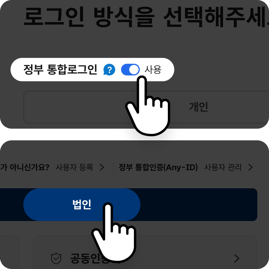 로그인 화면에서 정부 통합로그인 토글 버튼 사용 및 법인 탭 선택, 첫 이용 시 약관 동의 및 회원가입 절차가 있습니다.