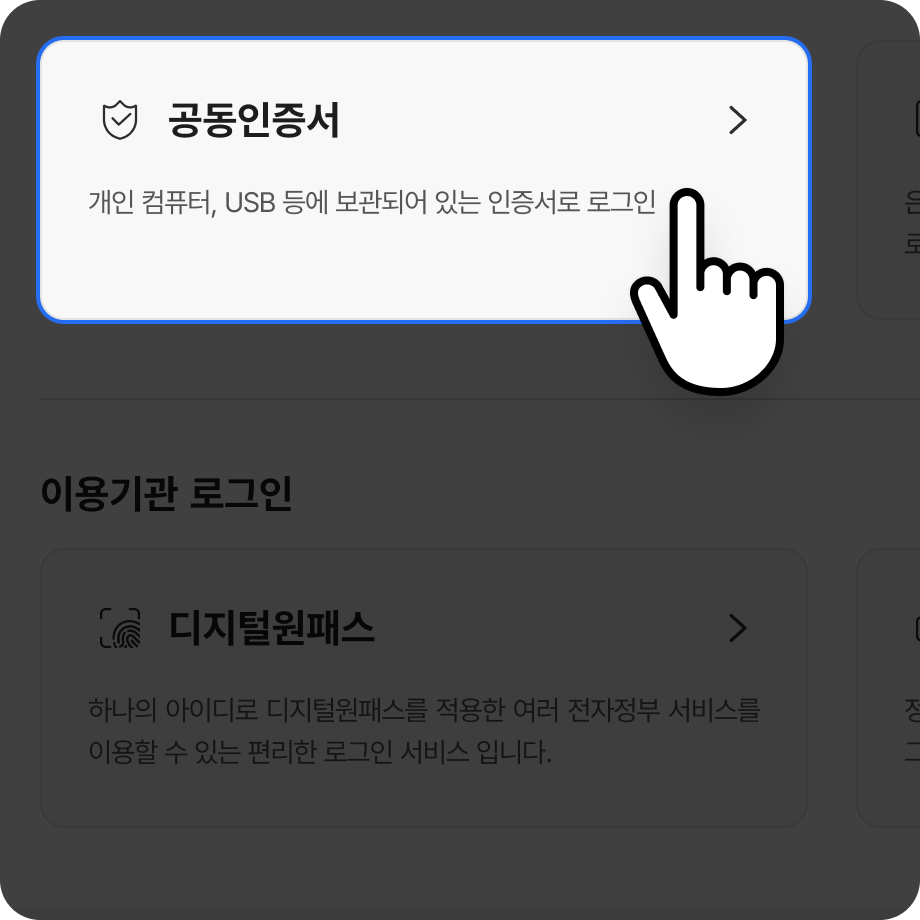 공동인증서, 금융인증서 중 원하는 방식으로 인증합니다.