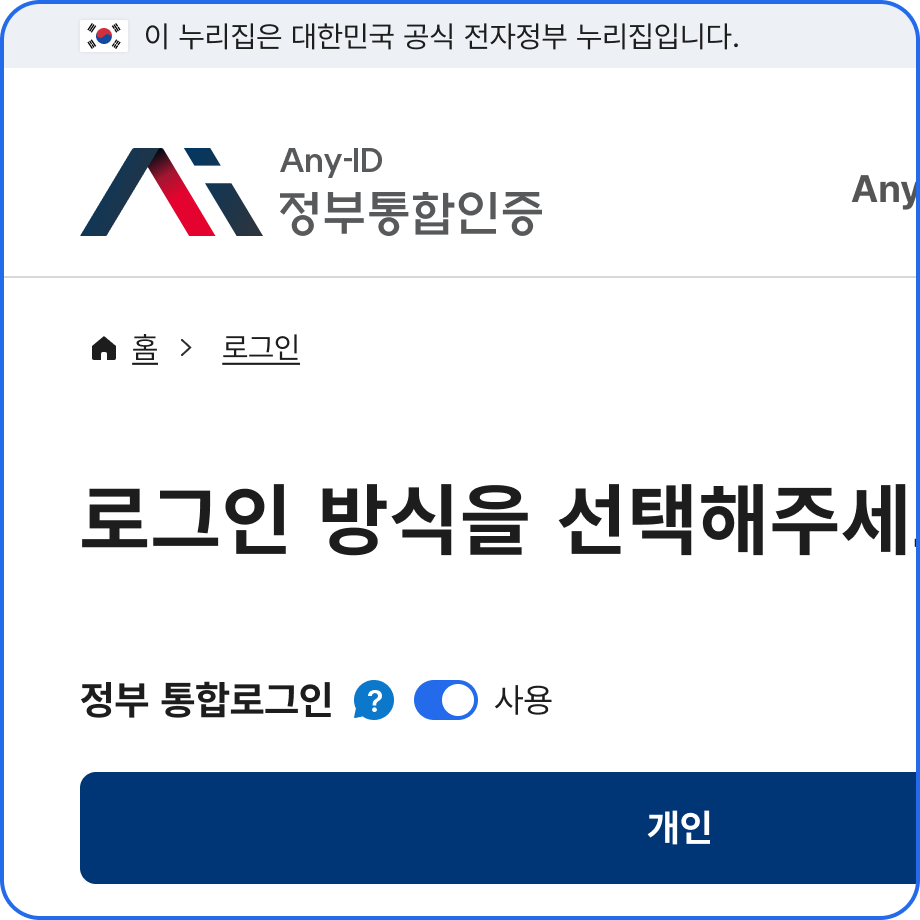 한 번 등록한 Any-ID는 정부 통합인증이 적용된 누리집에서 공통으로 사용 가능하며, 이후에는 간편하게 재로그인할 수 있습니다.