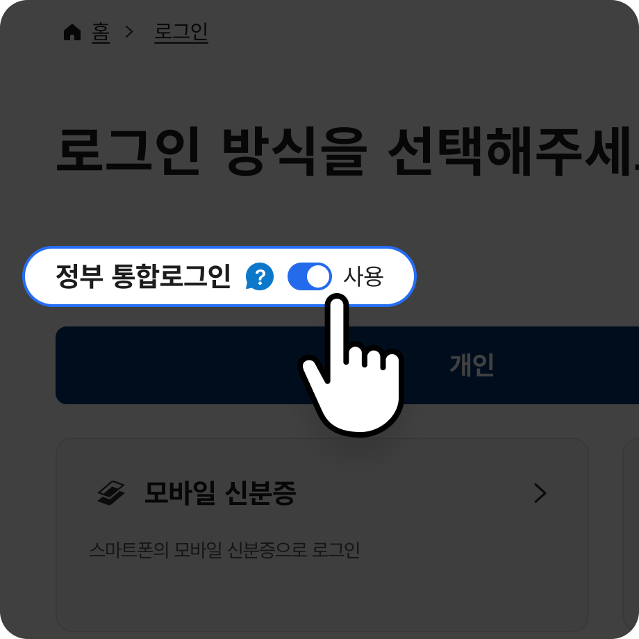 로그인 화면에서 정부 통합로그인 토글 버튼 사용을 선택합니다. 첫 이용 시 약관 동의 및 회원가입 절차가 있습니다.