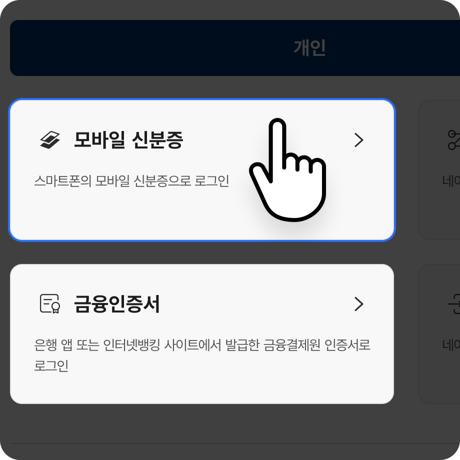 모바일 신분증, 간편인증, 공동인증서, 금융인증서 등 다양한 인증수단 중 원하는 방식으로 인증합니다.