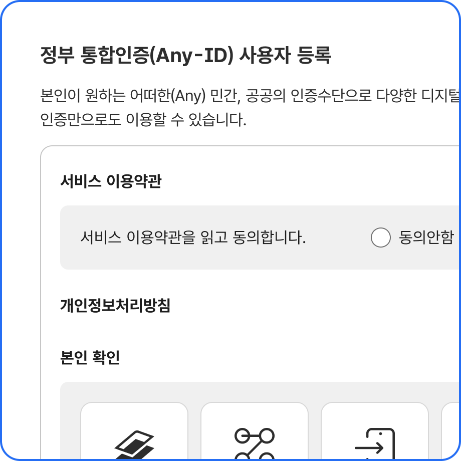 한 번 등록한 Any-ID는 정부 통합인증이 적용된 누리집에서 공통으로 사용 가능하며, 이후에는 간편하게 재로그인할 수 있습니다.