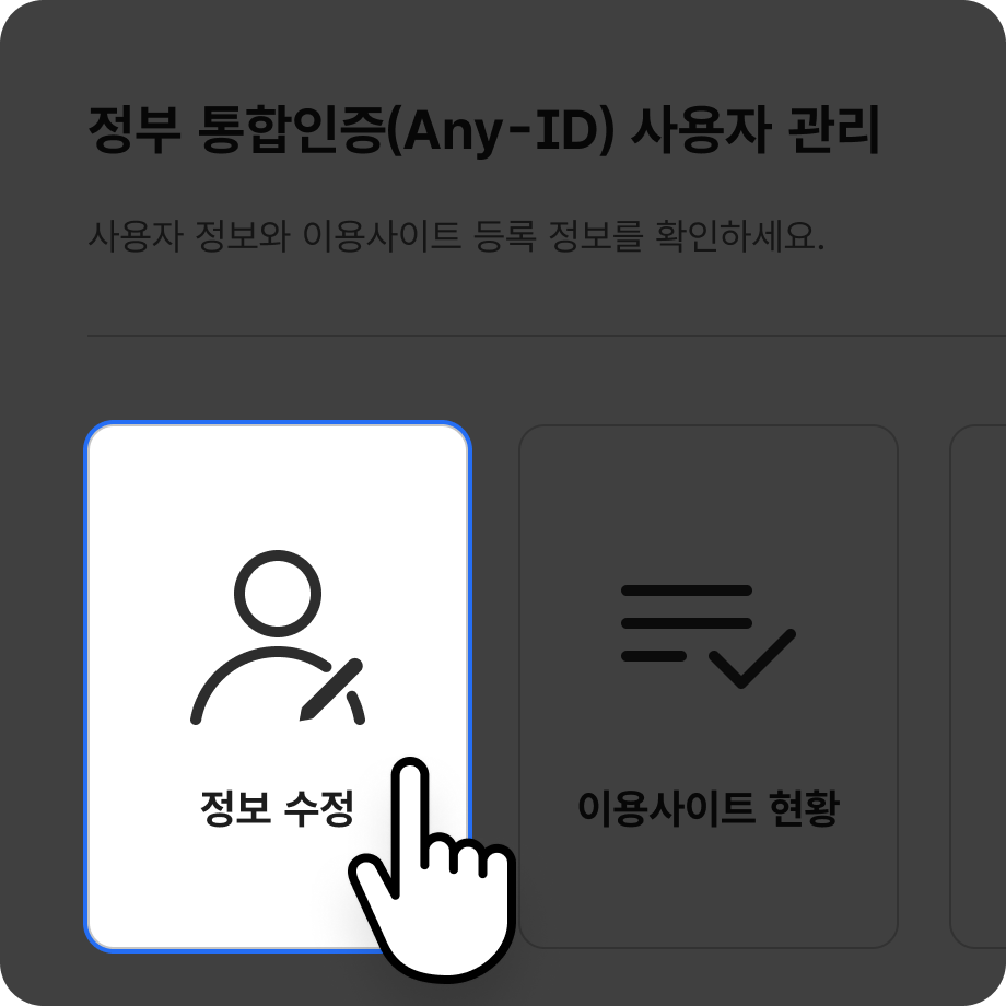 모바일 신분증, 간편인증, 공동인증서, 금융인증서 등 다양한 인증수단 중 원하는 방식으로 인증 후 연락처, 이메일, 주소 등 개인정보를 수정 하실 수 있습니다.